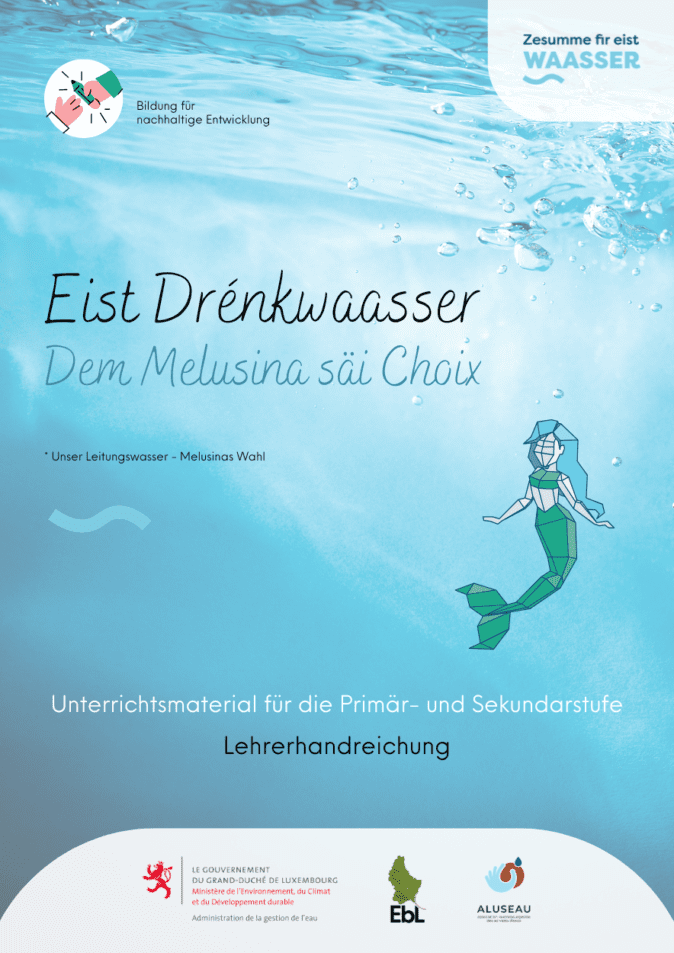 FR – Le matériel pédagogique « Eist Drénkwaasser – Dem Melusina säi Choix » s’adresse aux élèves de l’enseignement fondamental et secondaire et aborde la thématique de l’eau potable sous un angle environnemental. Il présente l’origine de l’eau du robinet au Luxembourg, ses avantages pour la santé et pour le développement durable, ainsi que les idées reçues qui l’entourent. Les élèves y apprennent à utiliser l’eau de manière responsable, à limiter l’usage des bouteilles en plastique et à approfondir leurs connaissances à l’aide de supports adaptés à leur âge.